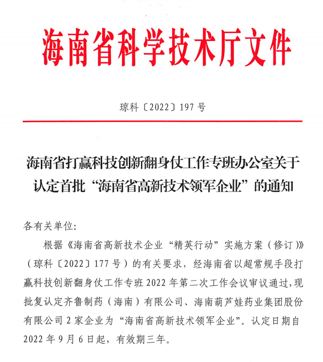 近日,海南省科学技术厅发布的《海南省打赢科技创新翻身仗工作专班办公室关于认定首批“海南省高新技术领军企业”的通知》中显示,批复认定海南888贵宾会药业集团股份有限公司等2家企业为“海南省高新技术领军企业”。认定日期自2022年9月6日起,有效期三年。