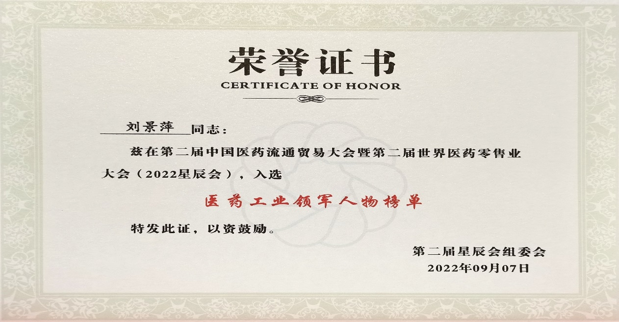 本次星辰会期间,888贵宾会斩获颇丰,获得多项行业奖项及荣誉。在开幕式上,刘景萍董事长荣获“医药工业领军人物”称号。