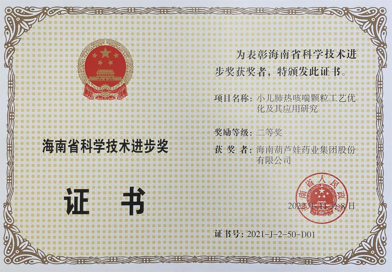 为此,小儿肺热咳喘颗粒的制备方法获得了第二十一届中国专利优秀奖(2019年),专利申请号:ZL201010134951,此次作为专利技术的应用,获得了2021年度海南省科学技术进步奖二等奖。在此之前,888贵宾会牌小儿肺热咳喘颗粒还多次被授予“临床价值中成药品牌”、“中国连锁药店最具合作价值单品”,荣登“中国医药品牌榜”。